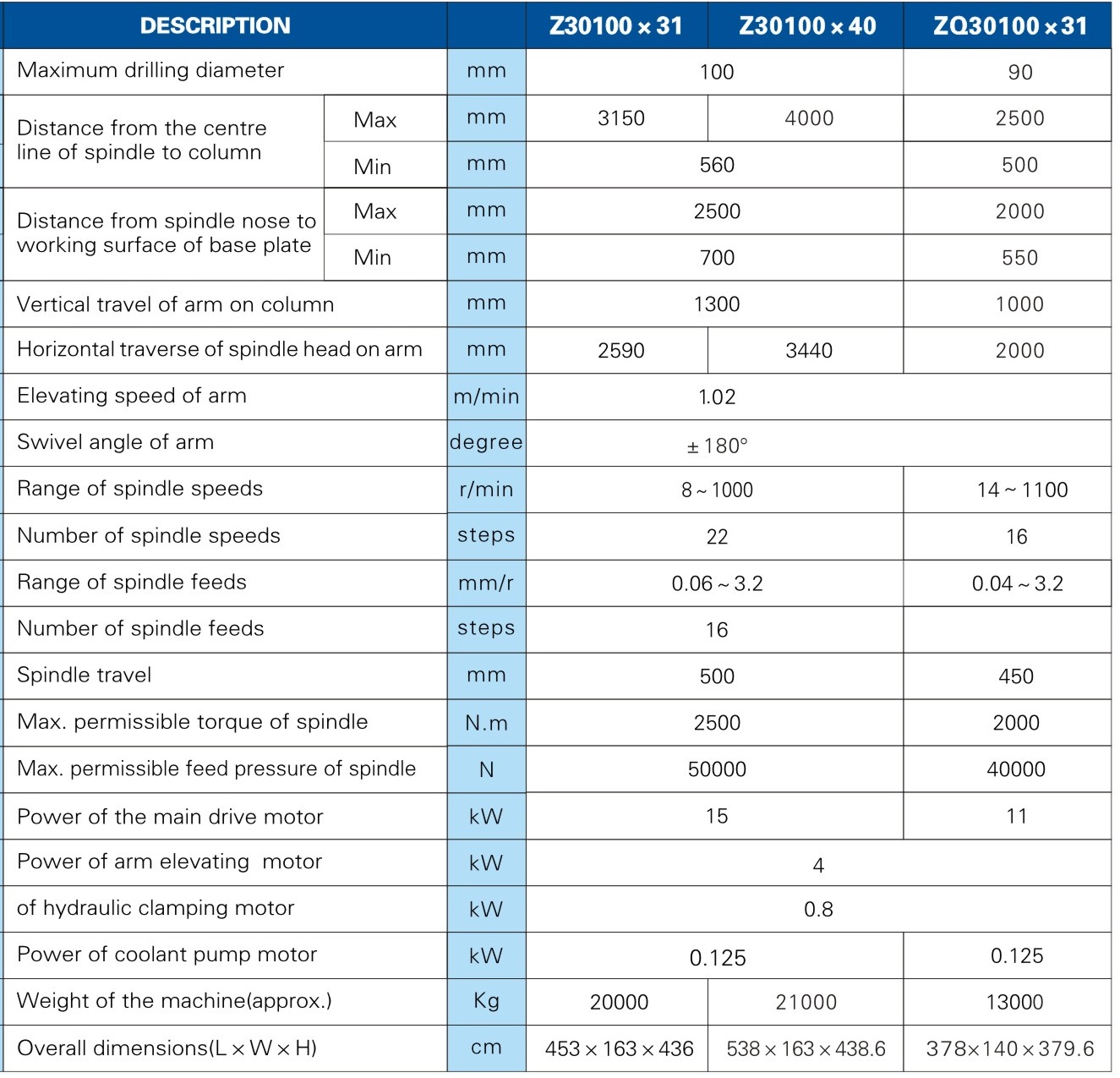 Radial Drilling Machine Model Z30100 is improved on the base of the new series products,it is the universal machine for general purposes, suitable for drilling, counter boring, reaming, spot facing and tapping on medium or large sized parts. Boring is also possible where such technological equipment is available.