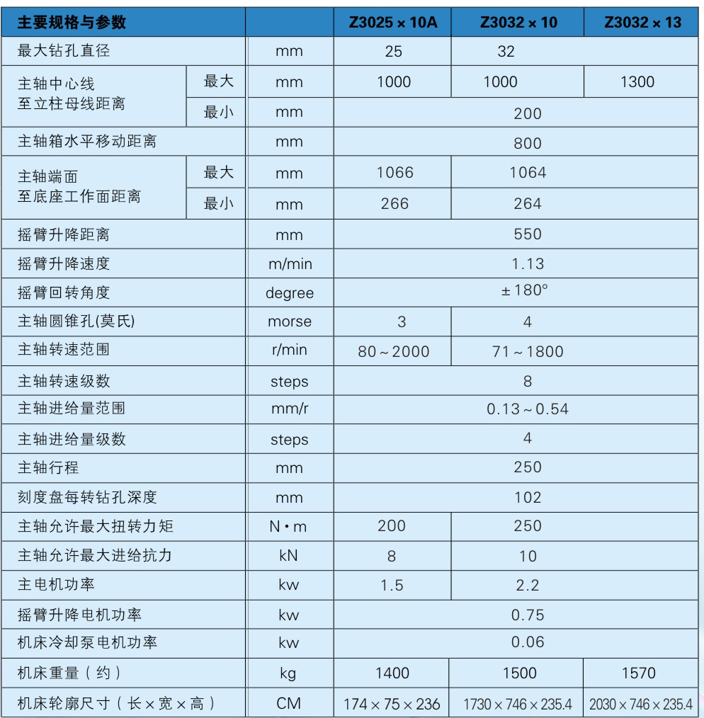 Z3032型搖臂鉆床,是參照國(guó)際標(biāo)準(zhǔn)設(shè)計(jì)制造成功的多功能新系列產(chǎn)品,機(jī)床主軸箱,搖臂,立柱手動(dòng)夾緊;主軸正反轉(zhuǎn),停車(制動(dòng)),空檔用一個(gè)手柄操作。它具有性能完善,使用安全,可靠,方便,易于維修,精度高,剛性好,壽命長(zhǎng)等優(yōu)點(diǎn)。用來(lái)鉆孔,擴(kuò)孔,鉸孔,攻螺紋和鏜孔。廣泛適用于機(jī)械加工各部位。
