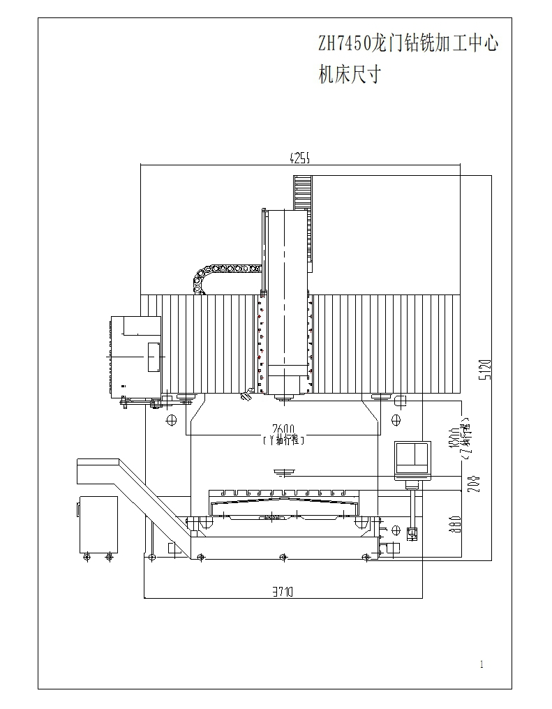 機床采用定梁雙立柱龍門式框架結構,工作臺在床身上作x向移動。滑鞍連同滑枕在橫梁上作y向移動,滑枕在滑鞍上作z向移動。三軸由交流伺服電機驅動,通同步帶傳動預拉伸結構的滾珠絲杠,實現(xiàn)三軸的運動與定位。主軸傳動采用主軸交流伺服電機實現(xiàn)主軸無級變速。安裝在橫梁左側的盤式刀庫,實現(xiàn)刀庫與主軸上刀具的互換。床身兩側安裝有排屑裝置,自動的把鐵屑排出到機床外。